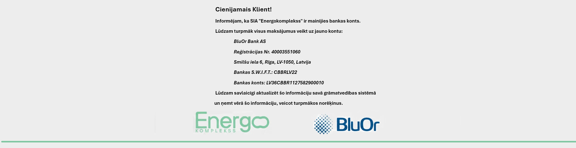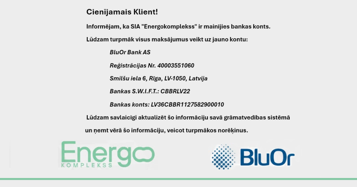 Informējam, ka SIA "Energokomplekss" ir mainījies bankas konts.